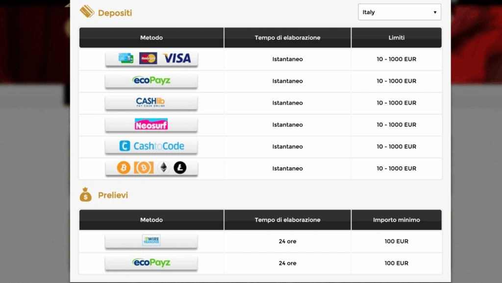 I giocatori italiani hanno a disposizione molti metodi per le transazioni finanziarie. È possibile utilizzare: